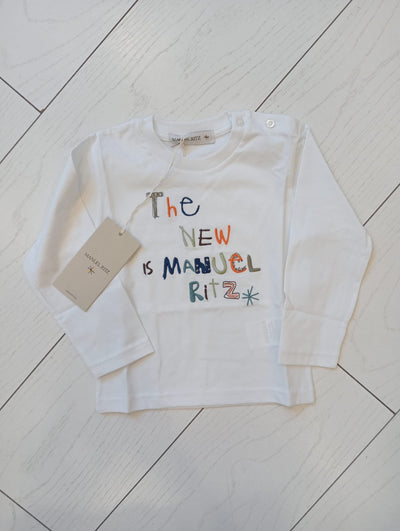 T-shirt manica lunga bambino, in cotone, con bottoni apertura sul colletto, scritte multicolor cucite in rilievo. Collezione autunno inverno Manuel Ritz.