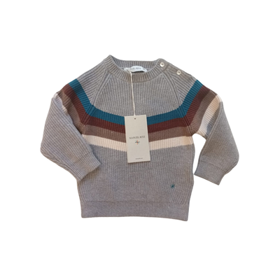 Maglia girocollo invernale elasticizzata, apertura con bottoni al colletto. Tema a righe fondo grigio, petrolio e toni del marrone.